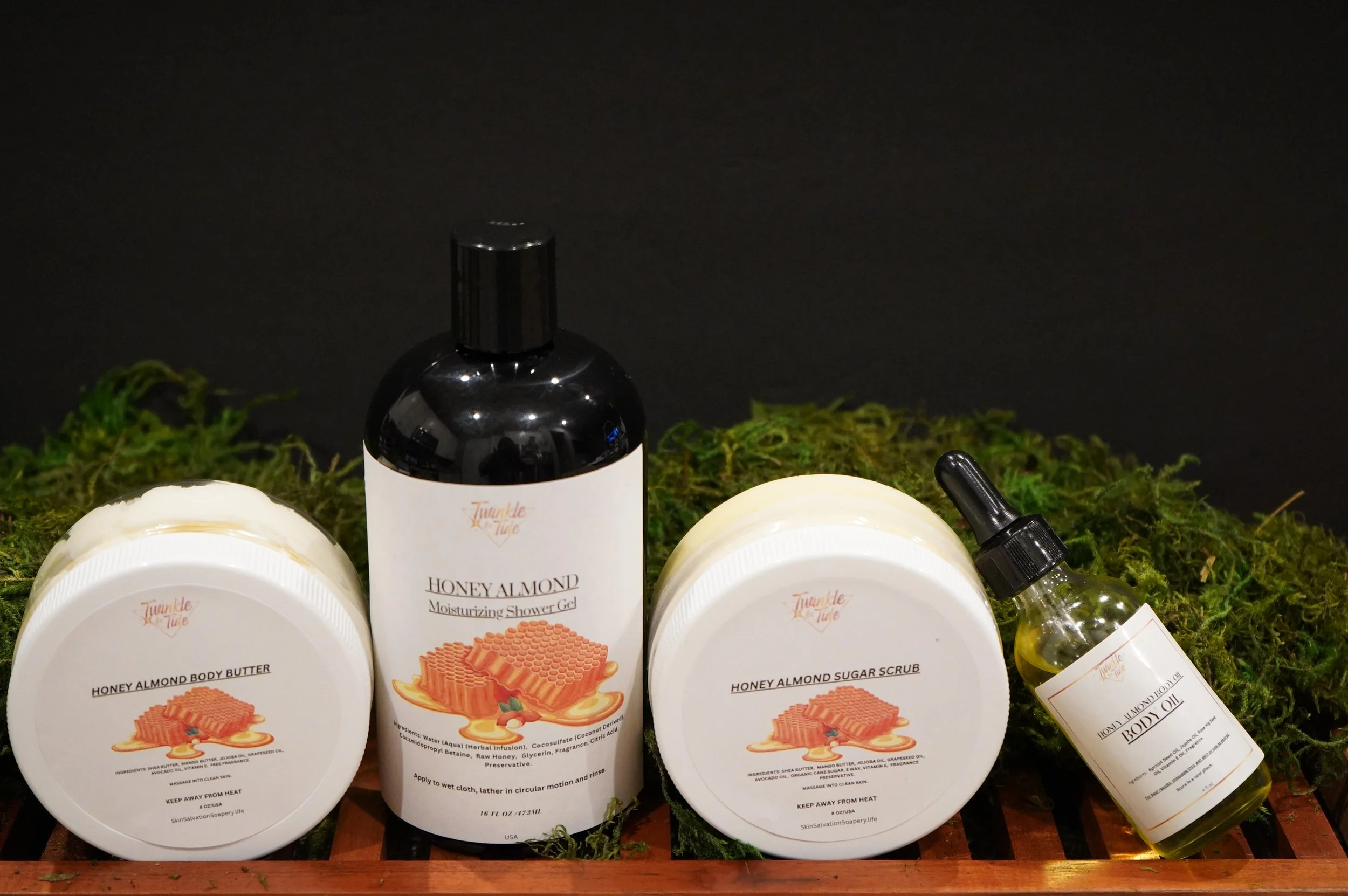 Elevate your bath time ritual with the All Natural Honey Almond Bath Collections that features: Honey Almond Shower Gel Elixir, Exfoliating Sugar Scrub, Moisturizing Body Butter, and Hydrating Body Oil. This harmonious collection is crafted to cleanse, nourish, and rejuvenate the body while surrounding you with the warm, comforting aroma of honey-kissed almonds.